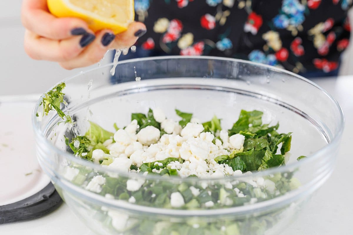 - Place the romaine, scallions, feta and dill in a large bowl and toss well. Drizzle with lemon juice, olive oil and garlic. Toss well then season with salt and pepper to taste before serving.