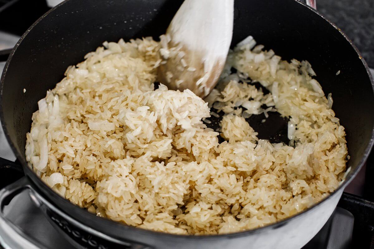- Heat butter over medium heat then add onion to the pan along with a pinch of salt and pepper. Saute onion until translucent then add in rice. Toast rice for about 60 seconds until you can begin to smell it.1 tablespoon butter, 1 medium onion, salt and pepper, 1 cup long-grain enriched white rice