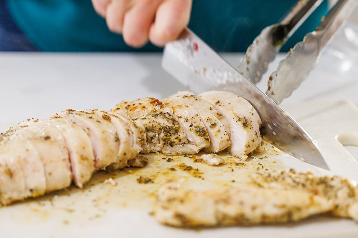 Once finished, take out of the oven and slice chicken to serve.