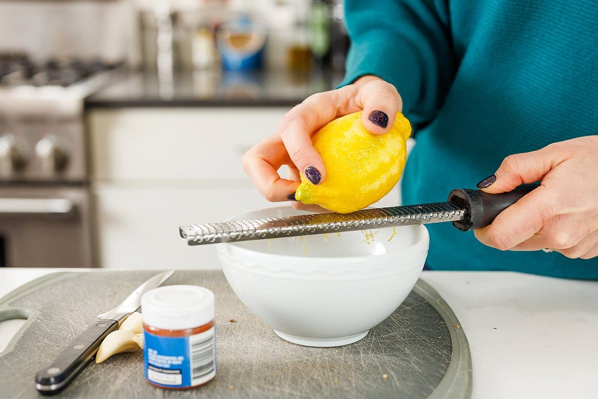 Next, zest a whole lemon into the bowl.