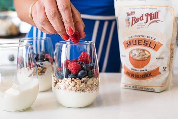 - Layer four glasses with 1/3 cup each Greek yogurt in the bottom. Top each glass with 2 tablespoons Bob’s Red Mill muesli then scatter with 1/4 cup berries. Repeat until you’ve used all the ingredients.