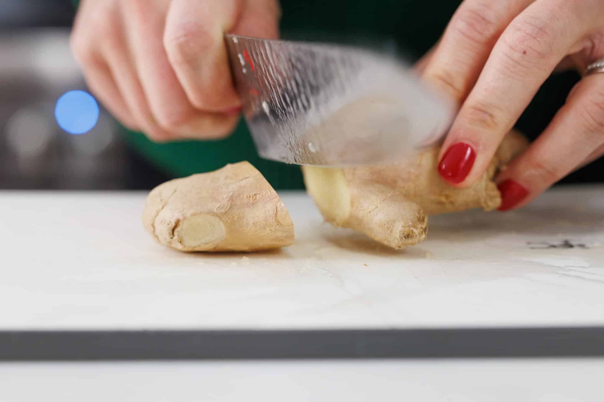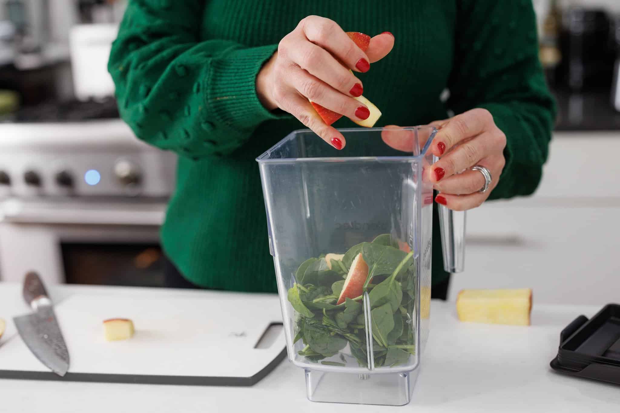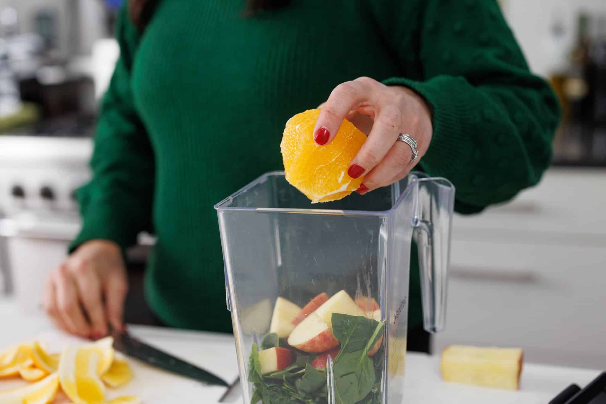 Start your Green Detox Smoothie by preparing your fresh ingredients. Cut up your ginger root and your apple, peel your orange, and wash and trim your spinach and parsley.