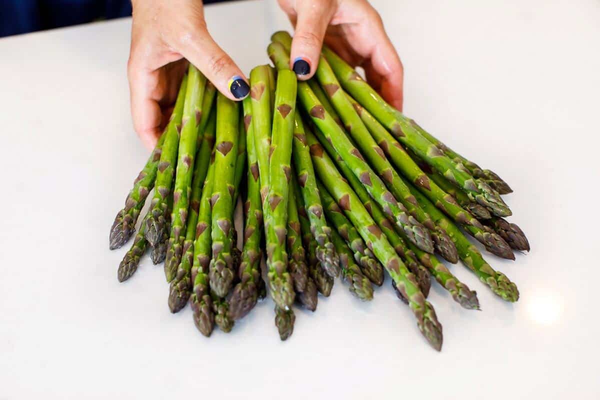 - Wash and trim asparagus then place in a large zip-lock bag.