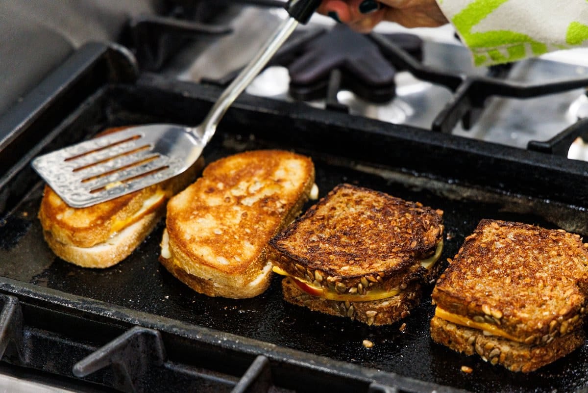 Step 3. On a griddle or frying pan over medium-high heat, add your sandwiches with the butter side down.