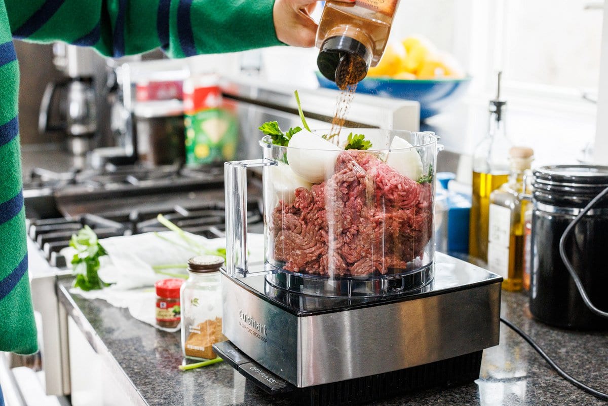 Start your Grilled Lebanese Beef Kafta Patties by putting your ground beef in a large food processor.