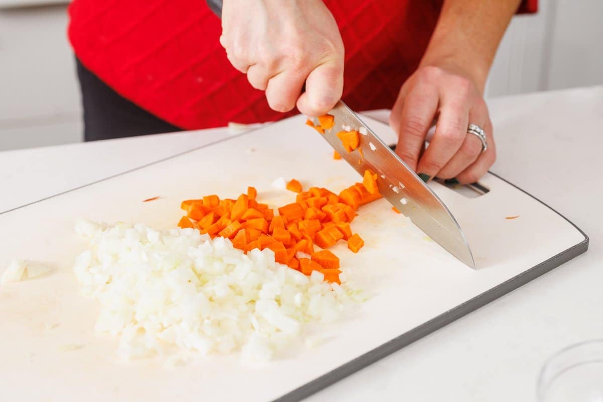 Start your ground turkey Bolognese by preparing your veggies. Dice your onion and carrot, slice your mushrooms, and mince your garlic.