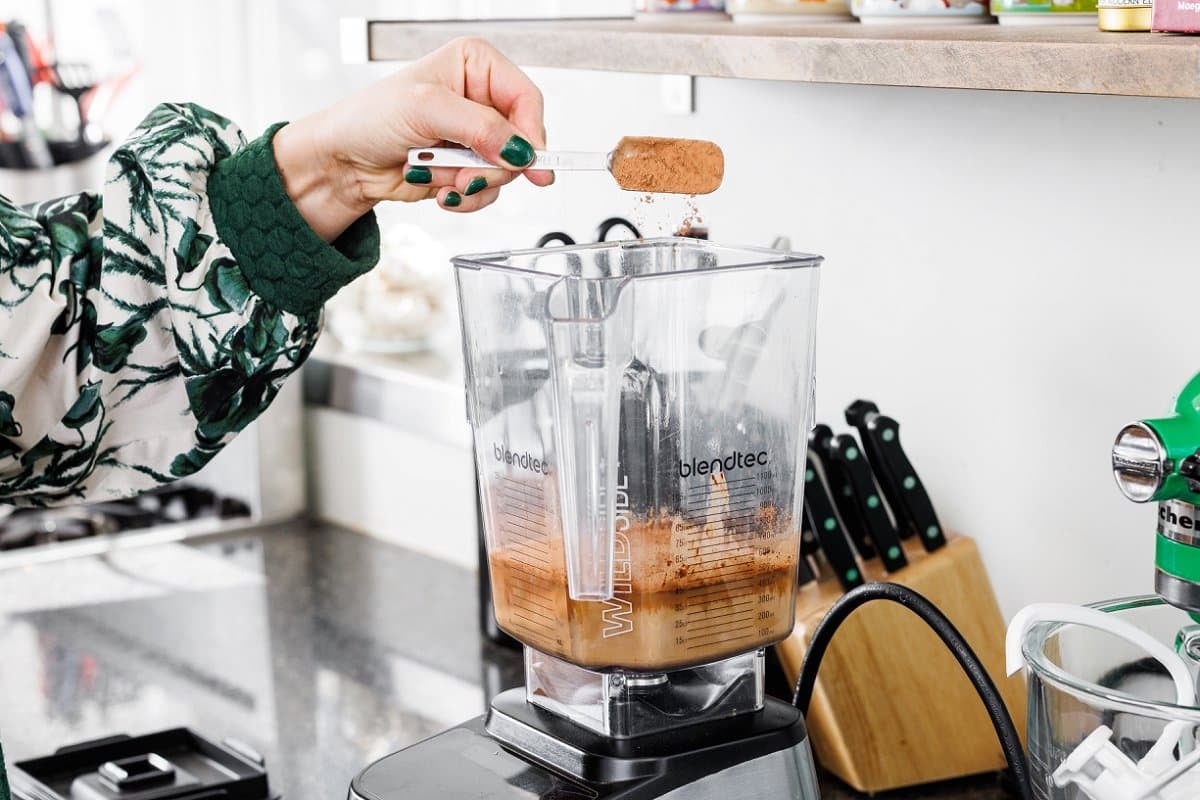 - Combine coffee, half and half, cocoa powder, vanilla, maple syrup and salt in a blender. Puree until smooth about 30-60 seconds. Add a scoop or two of ice and puree for additional 45-60 seconds on high.