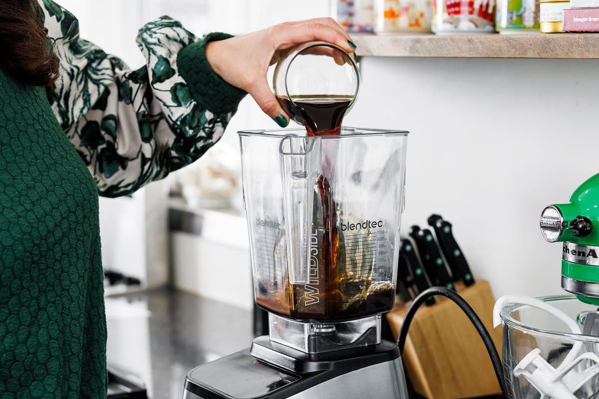 Start your healthy Starbucks mocha Frappuccino by adding your coffee to a blender.
