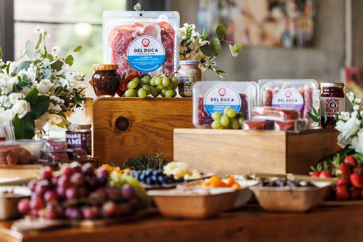 Since charcuterie literally means cured meat, picking the right kind is important. I loved using Del Duca‘s wide selection of salami, prosciutto, and capocollo for our boards. With varying levels of peppery and strong or mild and smooth flavors, they pair well with all sorts of cheeses and fruits. Also include on your tray some accompanying sides like: olives, pickles, fresh or dried fruits, nuts, herbs, and sauces like a spicy mustard or sweet honey. When picking your cheeses, have a selection of hard cheese, like parmesan or gouda, and soft cheese, like mascarpone or burrata. Want to keep it meat free? Try my smoked fish charcuterie board instead!