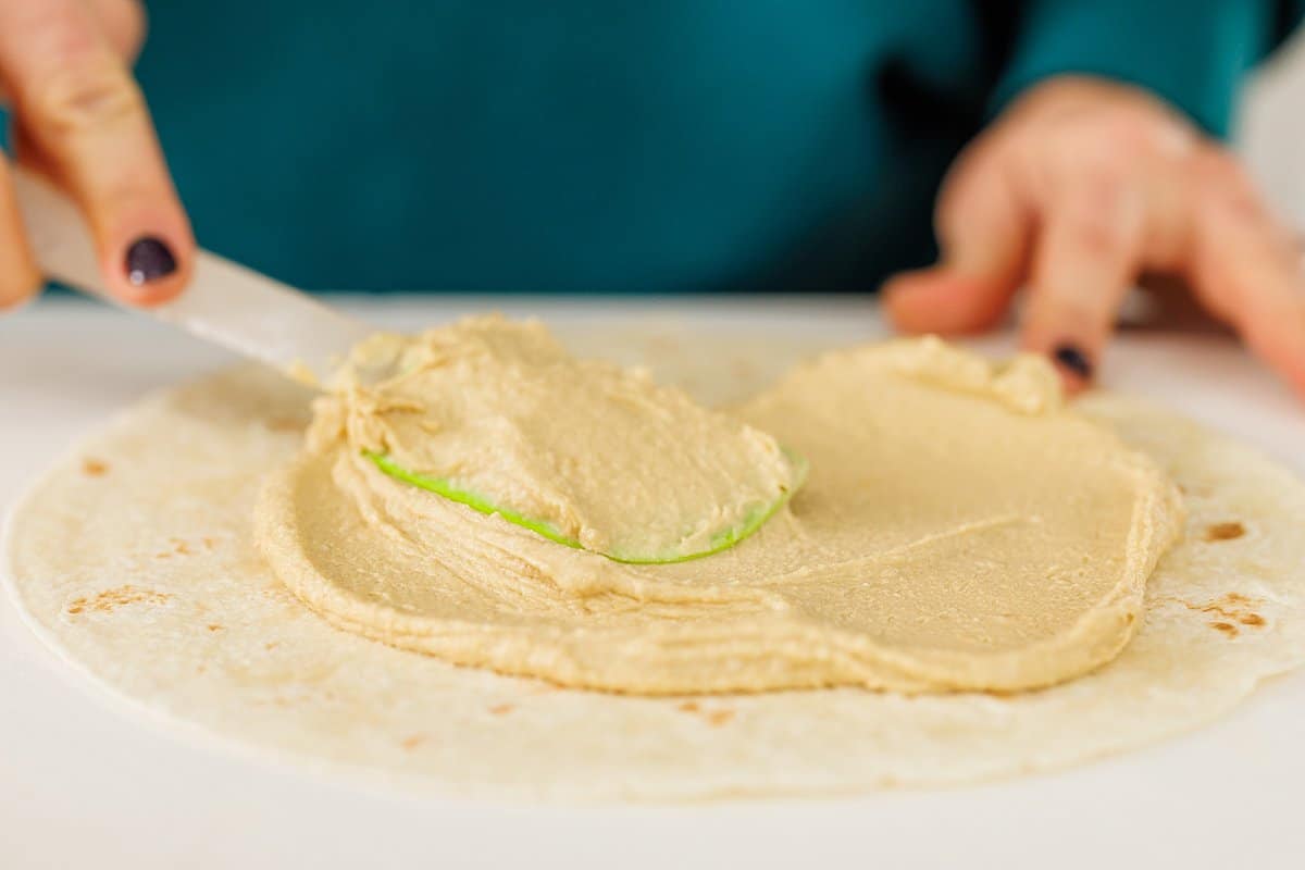 Next take your tortilla and spread hummus evenly over the surface, leaving about 1/4 inch clear around the edges.