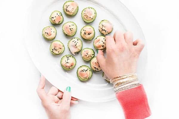 Whether or not you have little ones at home, I think we can all agree: snacks are life. When my friends at Sabra asked me to create a healthy snack recipe, I decided to create a sushi-inspired Hummus Cucumber Bite with Pickled Ginger.