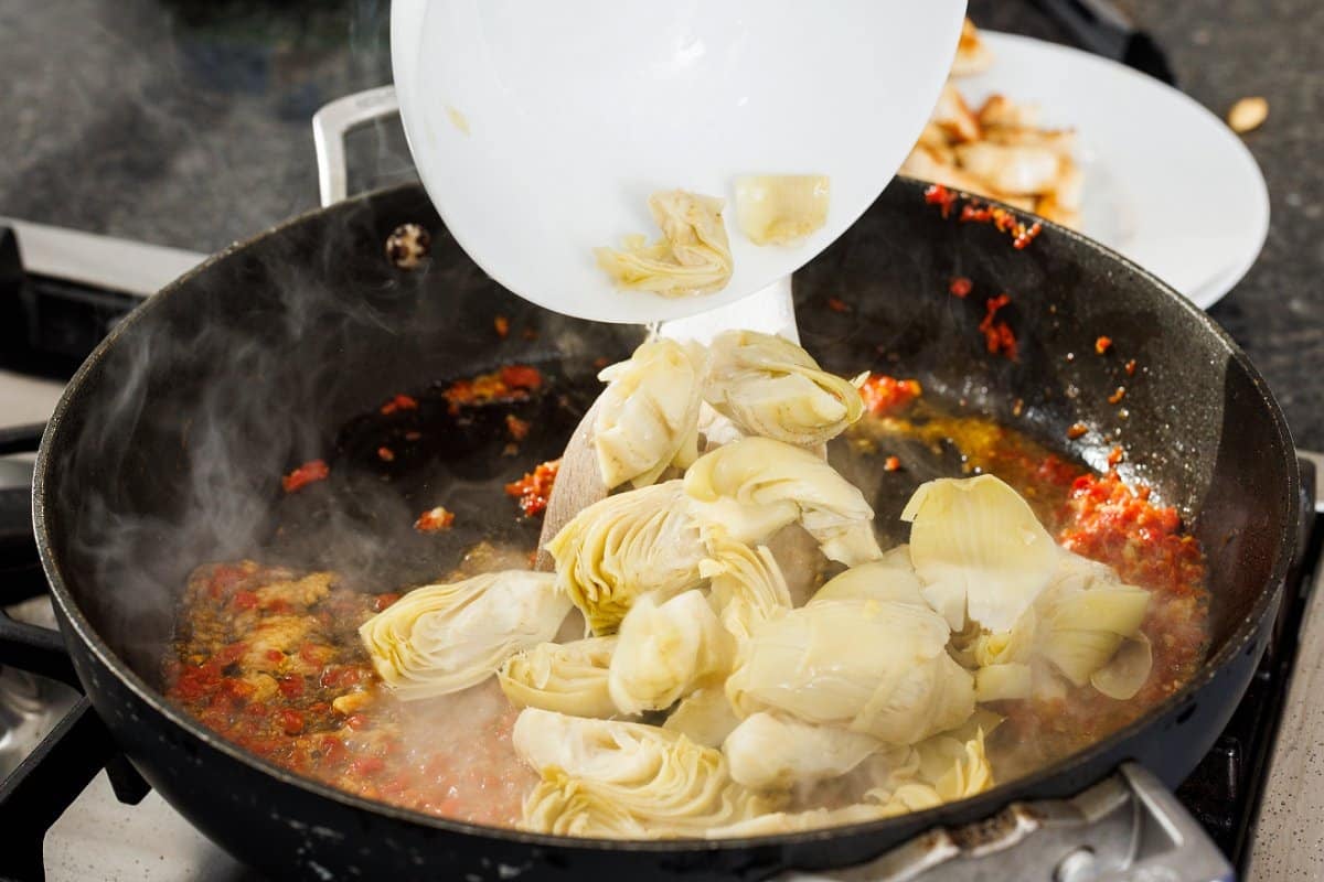 - Add the white wine to the hot pan to deglaze, using a wooden spoon to scrape up all the browned bits. Add the garlic to the pan and heat until fragrant, about 30 seconds, before stirring in the artichoke hearts, sun-dried tomatoes and reserved chicken cubes.