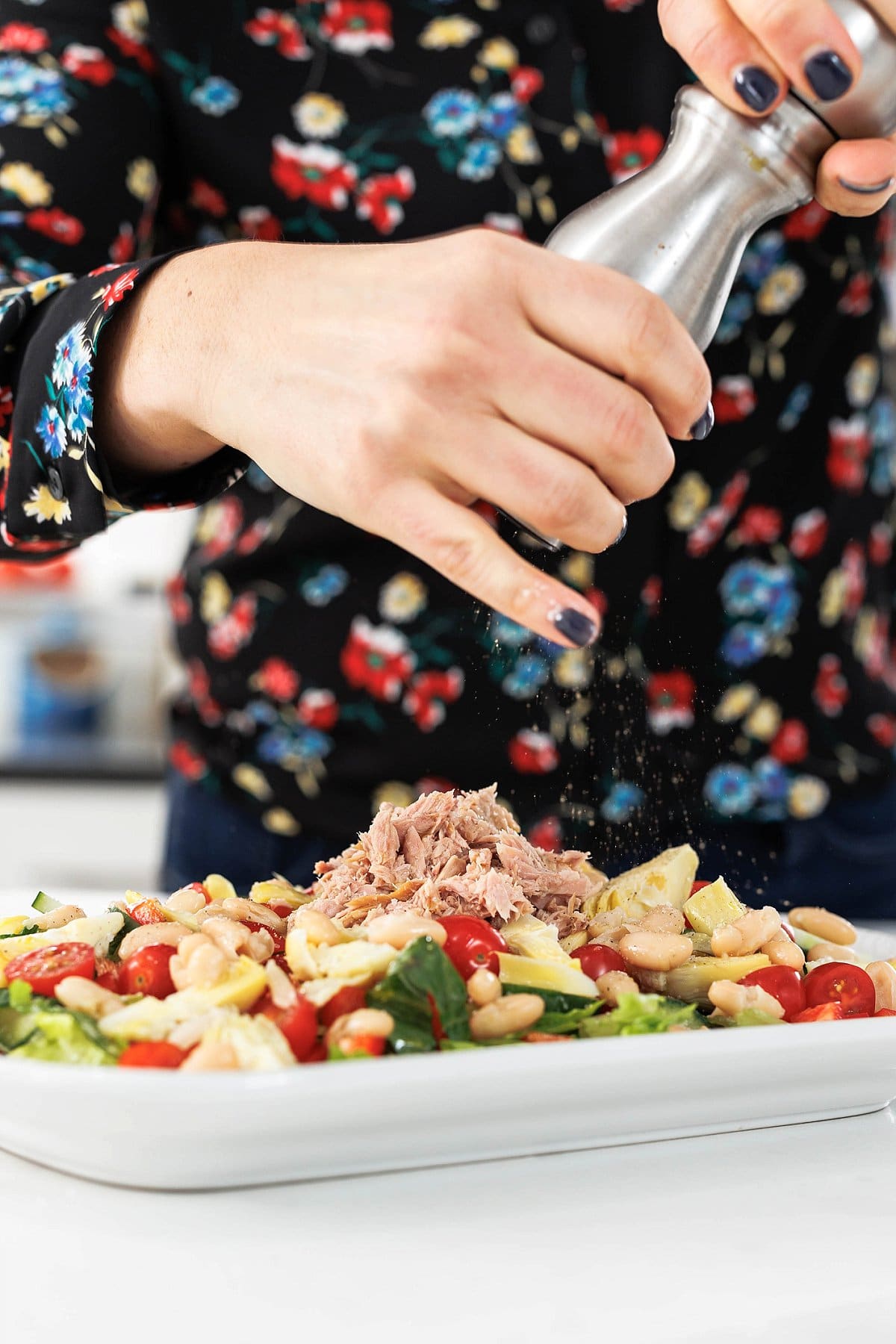 This light and refreshing Italian chopped salad with cannellini beans, tuna, and artichokes is bursting with flavor and packed with protein to give you energy all afternoon long.