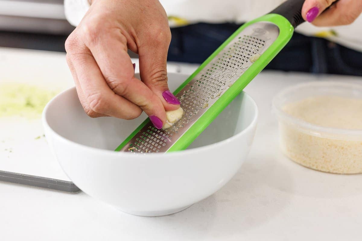 Then make your lemon garlic vinaigrette by first grating your garlic into a small bowl using a microplane.