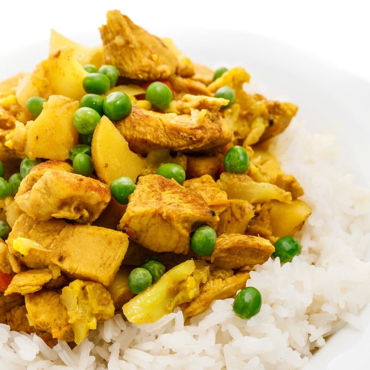 - In a medium bowl, toss chicken cubes with 1 tablespoon of the curry powder and a good pinch of salt and pepper.