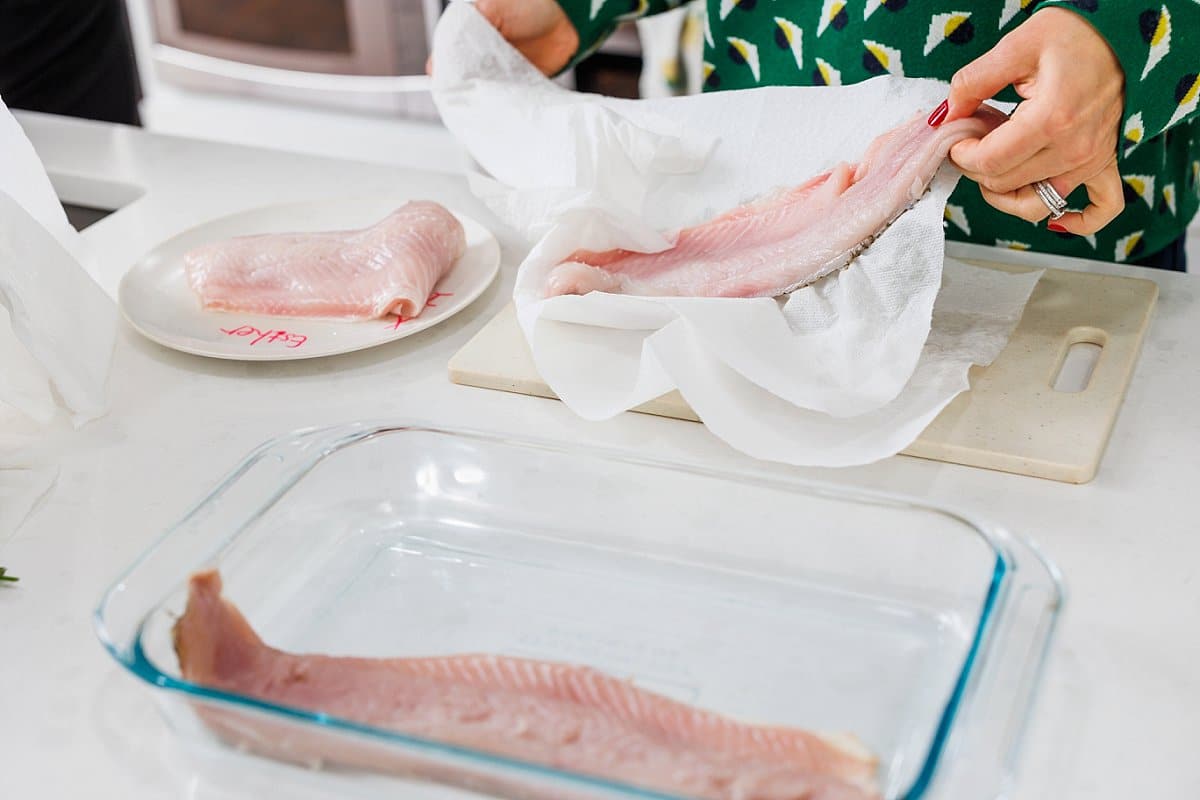Start by cooking your fish. Pat them dry, and lay the fillets in a flat layer in a prepared baking dish.