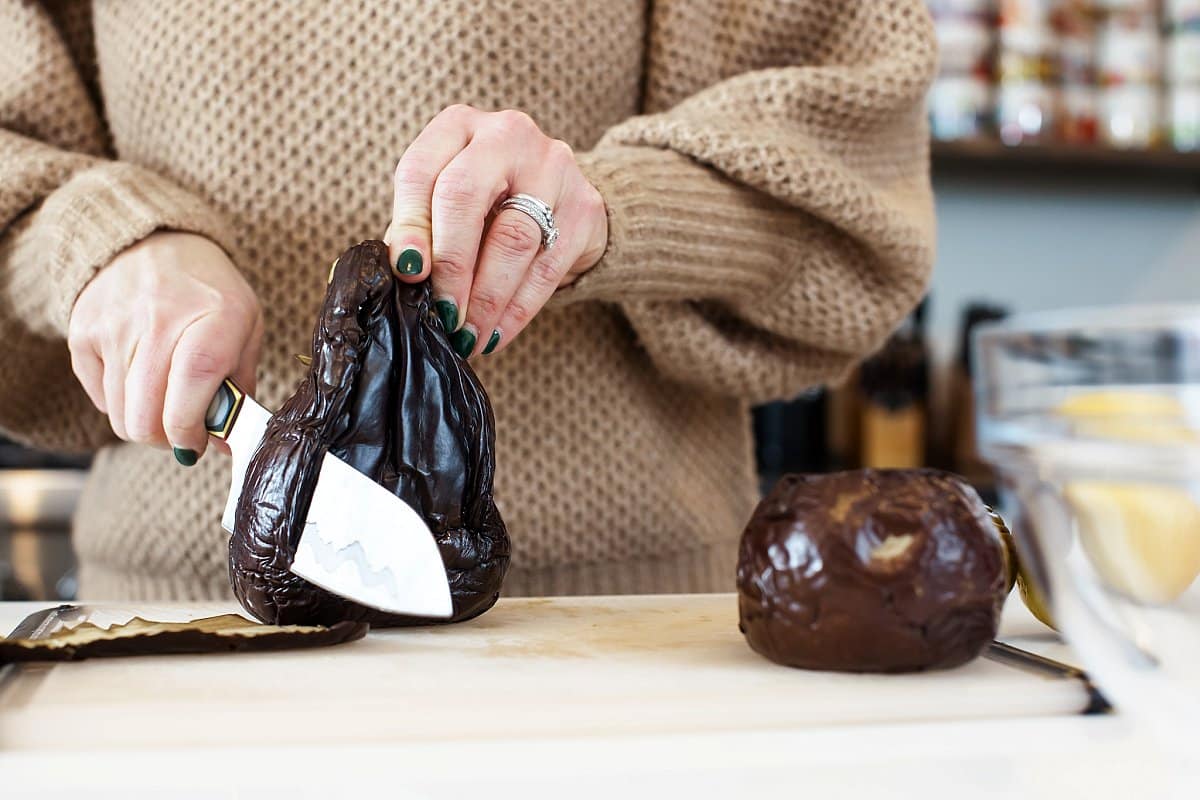 When eggplant is done baking, let cool, then use a knife to peel and cut into small cubes.