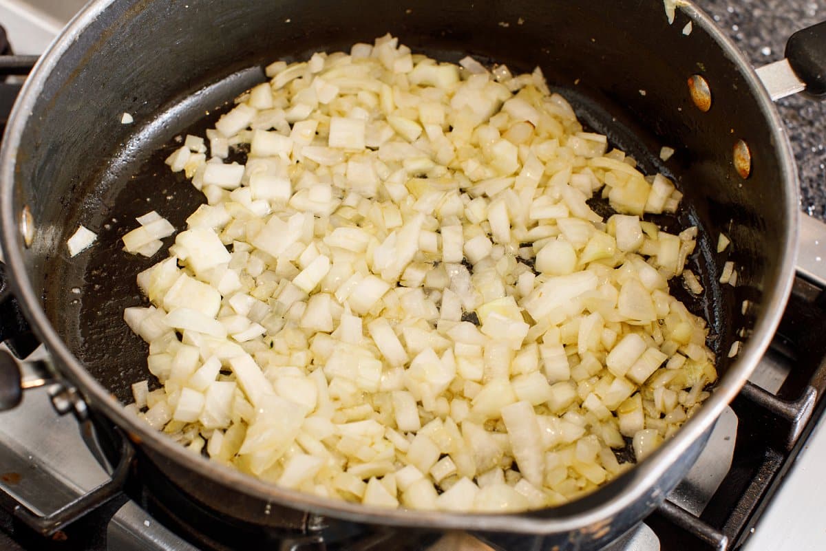 Start by melting your clarified butter over medium-high heat, then add in your diced onion and sauté until slightly translucent.