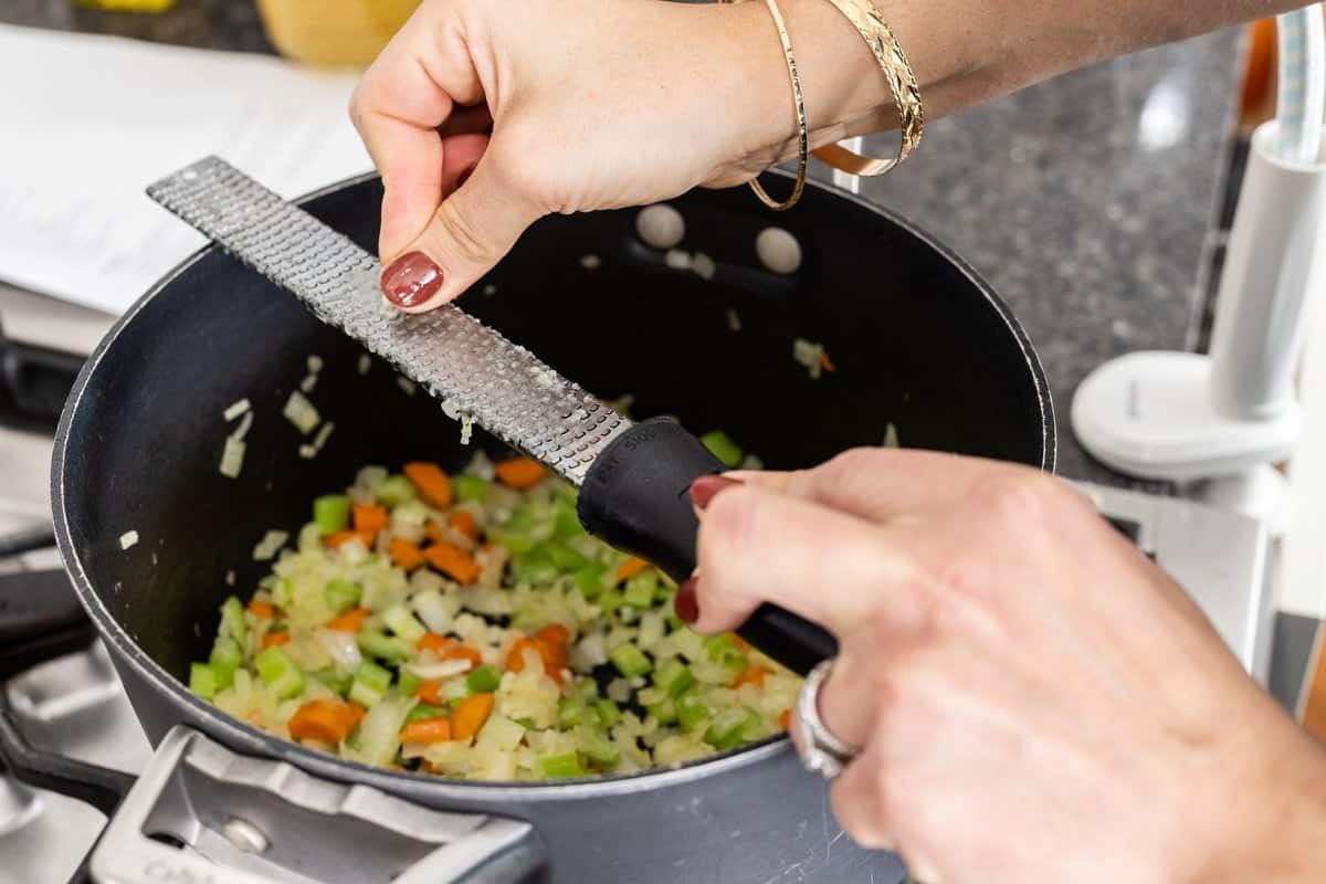 Start your Lebanese lentil soup with greens by heating the olive oil in the bottom of a large soup pot. Add the onion, celery, and carrots and cook until they begin to soften. Then use a microplane to grate the garlic cloves into the pot along with the cinnamon and cumin. Stir and cook until fragrant.