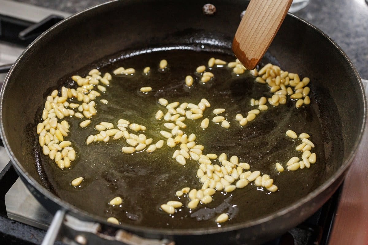 Add your pine nuts to the pan and toast until evenly browned. Watch them so they don’t burn, and set aside.