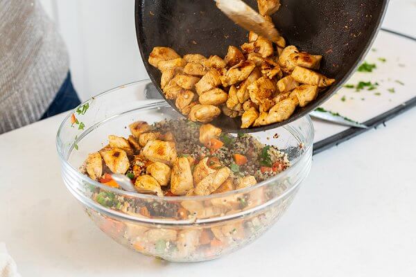 - Add cooked Lebanese Shish Tawook Chicken or any cooked protein to the bowl. Stir in all remaining ingredients and toss well. Check for seasoning and adjust accordingly.