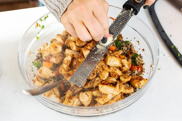 For this Lebanese Quinoa Salad, I toss together cooked quinoa with Shish Tawook Chicken, carrots, peppers, scallions, and parsley.