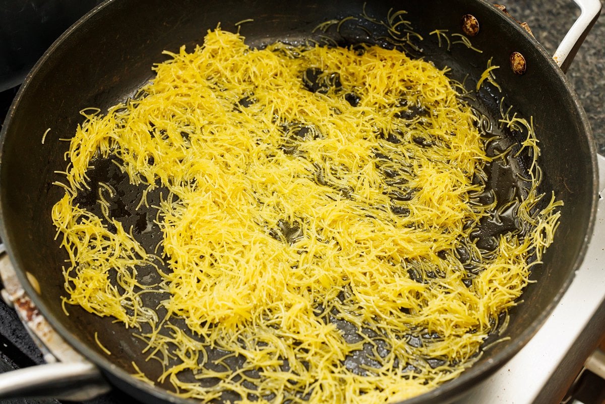 - In a large, deep pan heat the butter over medium heat until melted. Add the broken vermicelli pasta and brown, stirring frequently, until it is golden/dark brown. Be careful to not let burn – don't walk away from the pan. This takes about 4-5 minutes.