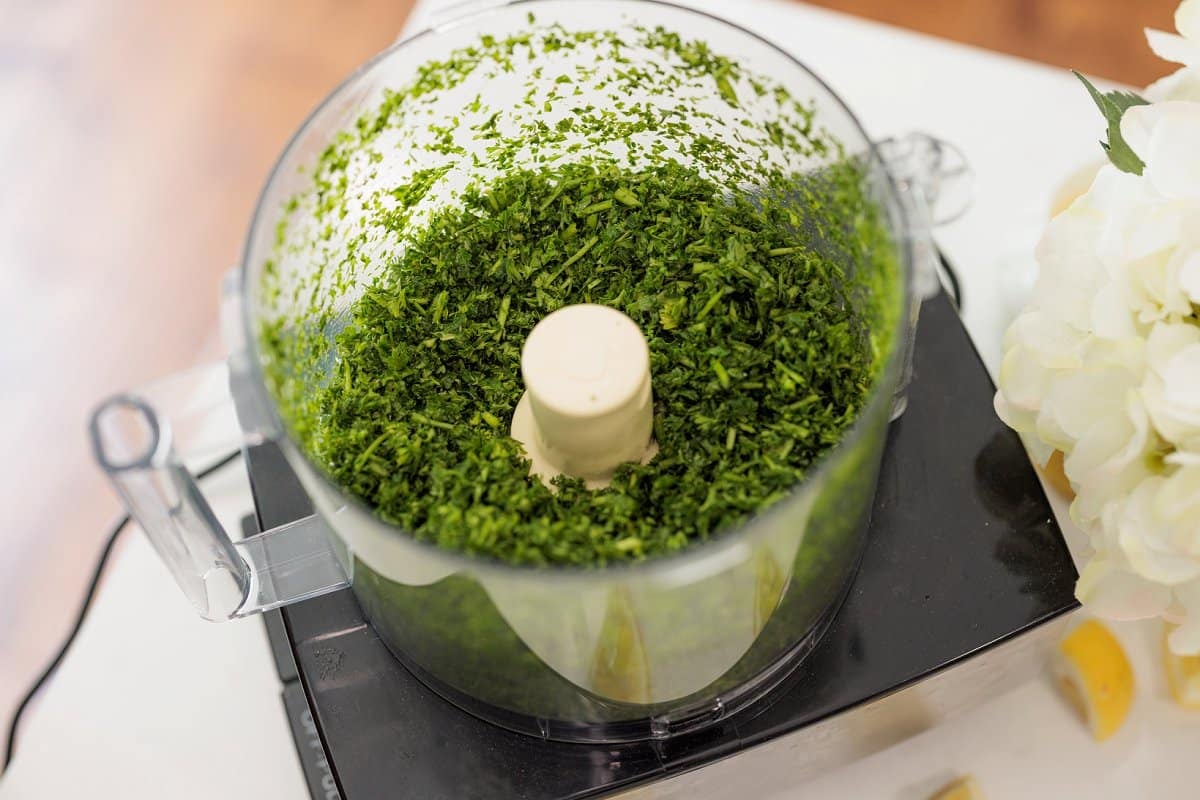 To finely mince my fresh herbs, I like to just throw them in my food processor. Add your parsley, scallions, and mint and pulse until finely chopped.