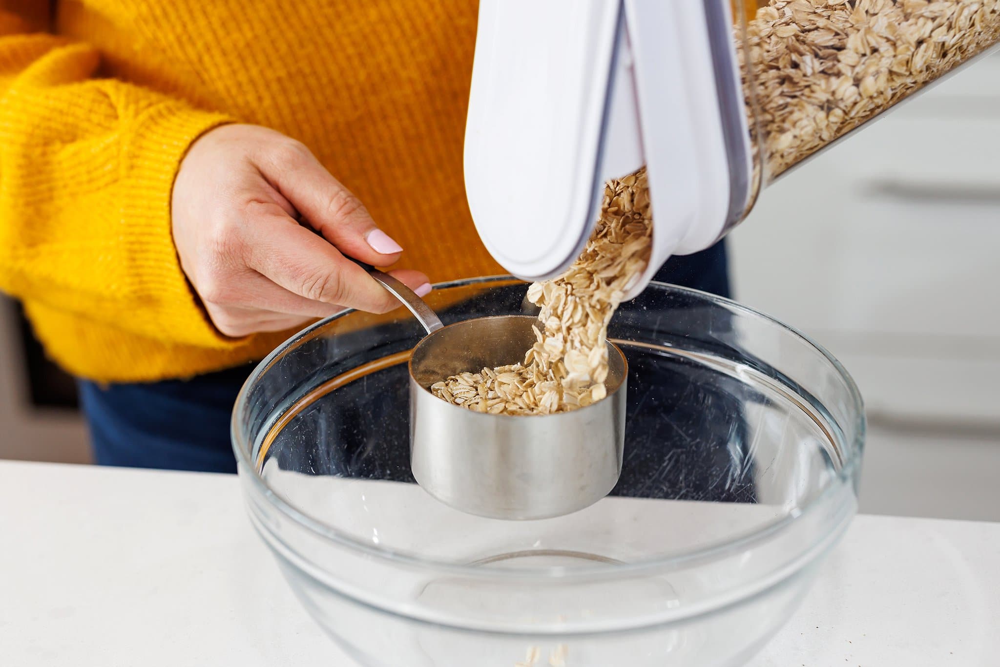 Next, you’ll mix your dry ingredients together. First you’ll measure out your white flour.