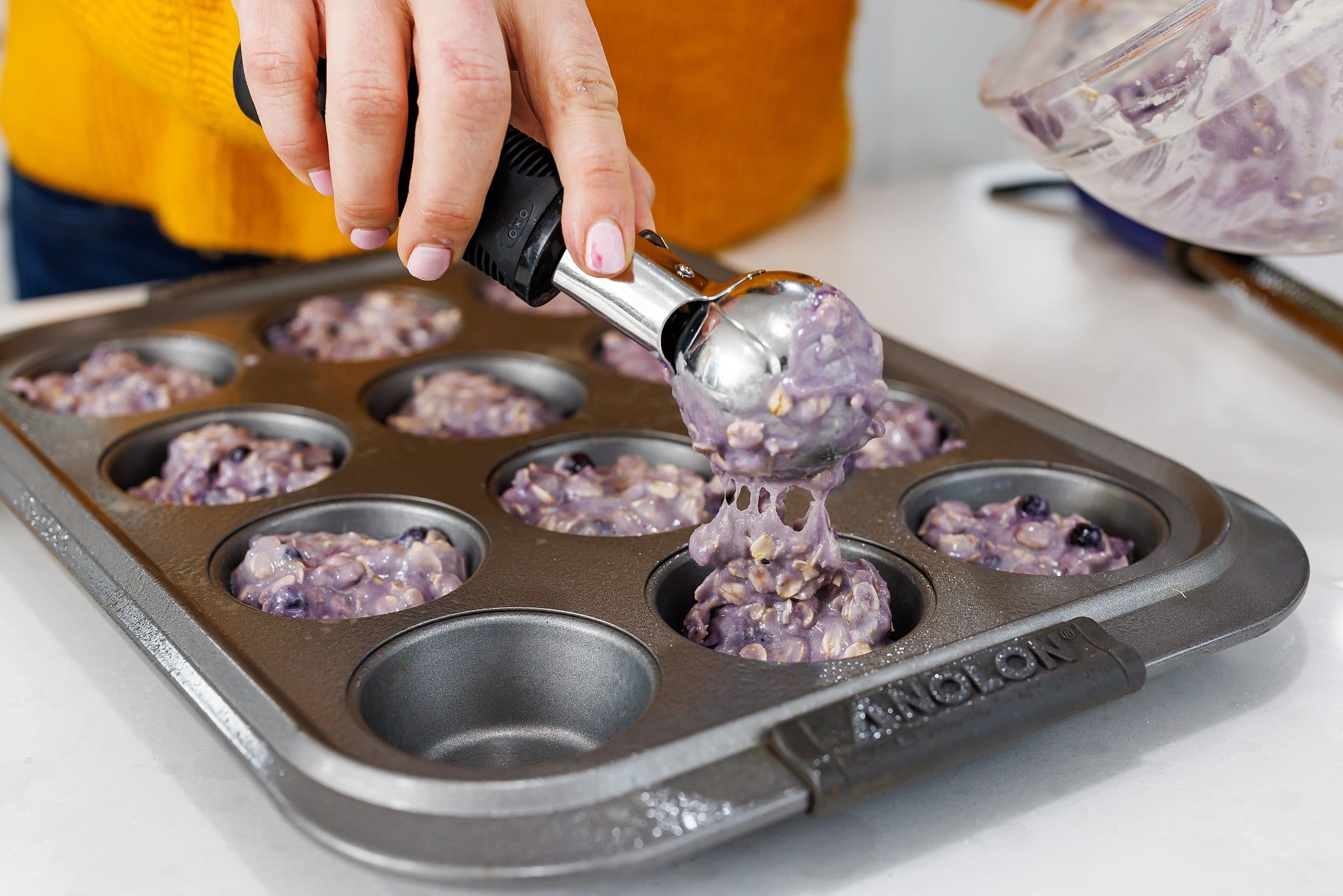Then using a spoon or ice cream scoop, evenly portion out the batter into your prepared muffin tin.