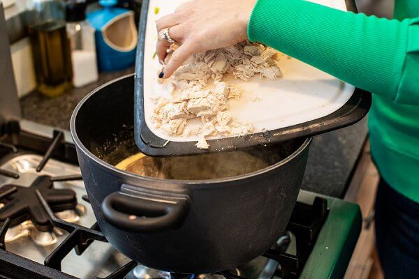 - Add shredded chicken breasts and cook until heated through. Check for seasoning and adjust accordingly. Serve with sliced scallions if you wish.