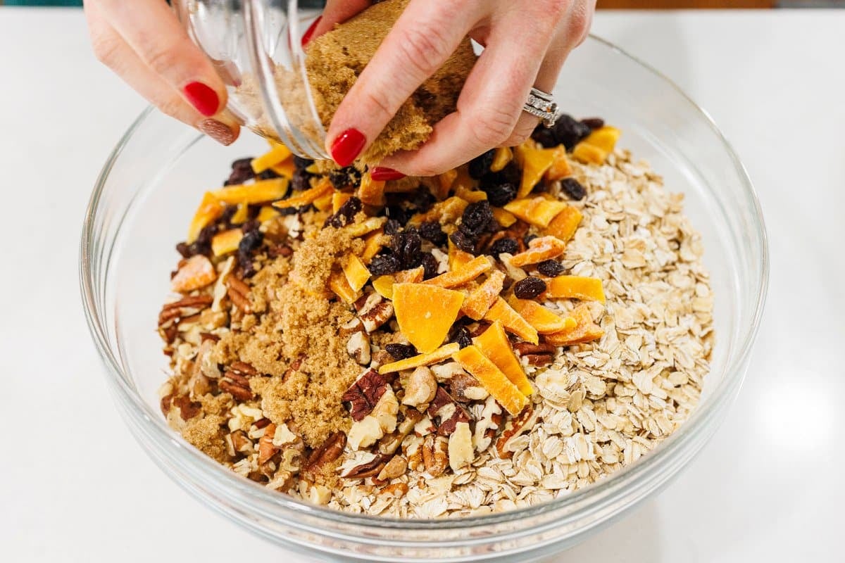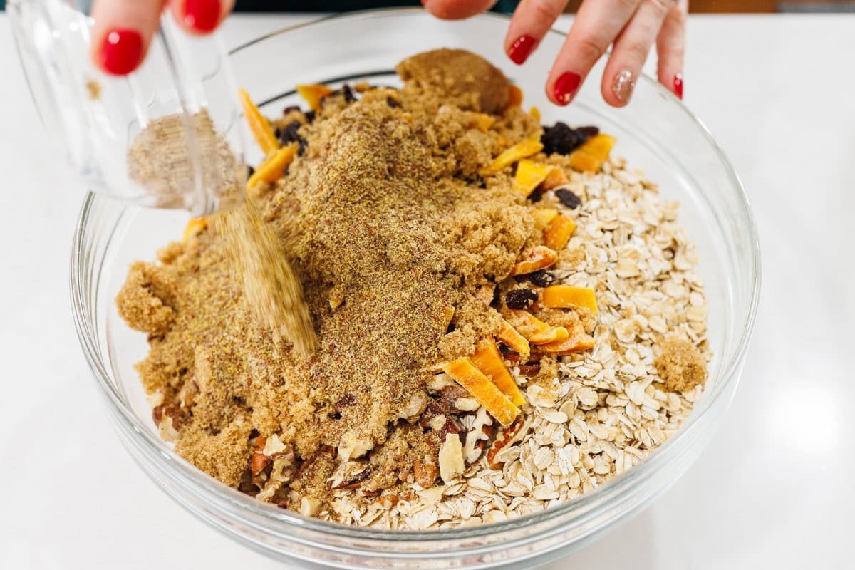 - In a large mixing bowl, combine all ingredients including toasted nuts. Store in an air-tight container for up to 3 weeks.8 cups old fashioned oats, 2 cups dried fruit, 1/2 cup brown sugar, 1/4 cup flax seed meal, 3 tablespoons cinnamon, 1 tablespoon salt, 1/2 tablespoon nutmeg, 1/4 tablespoon ground cloves