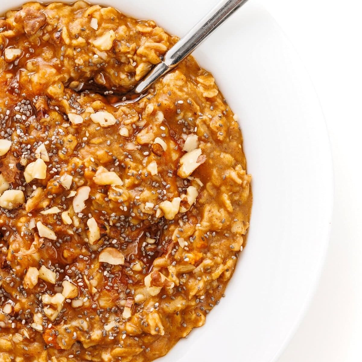 Creamy maple pumpkin oatmeal with chia is packed with protein and nutrients with just the right amount of pure maple syrup for sweetness.