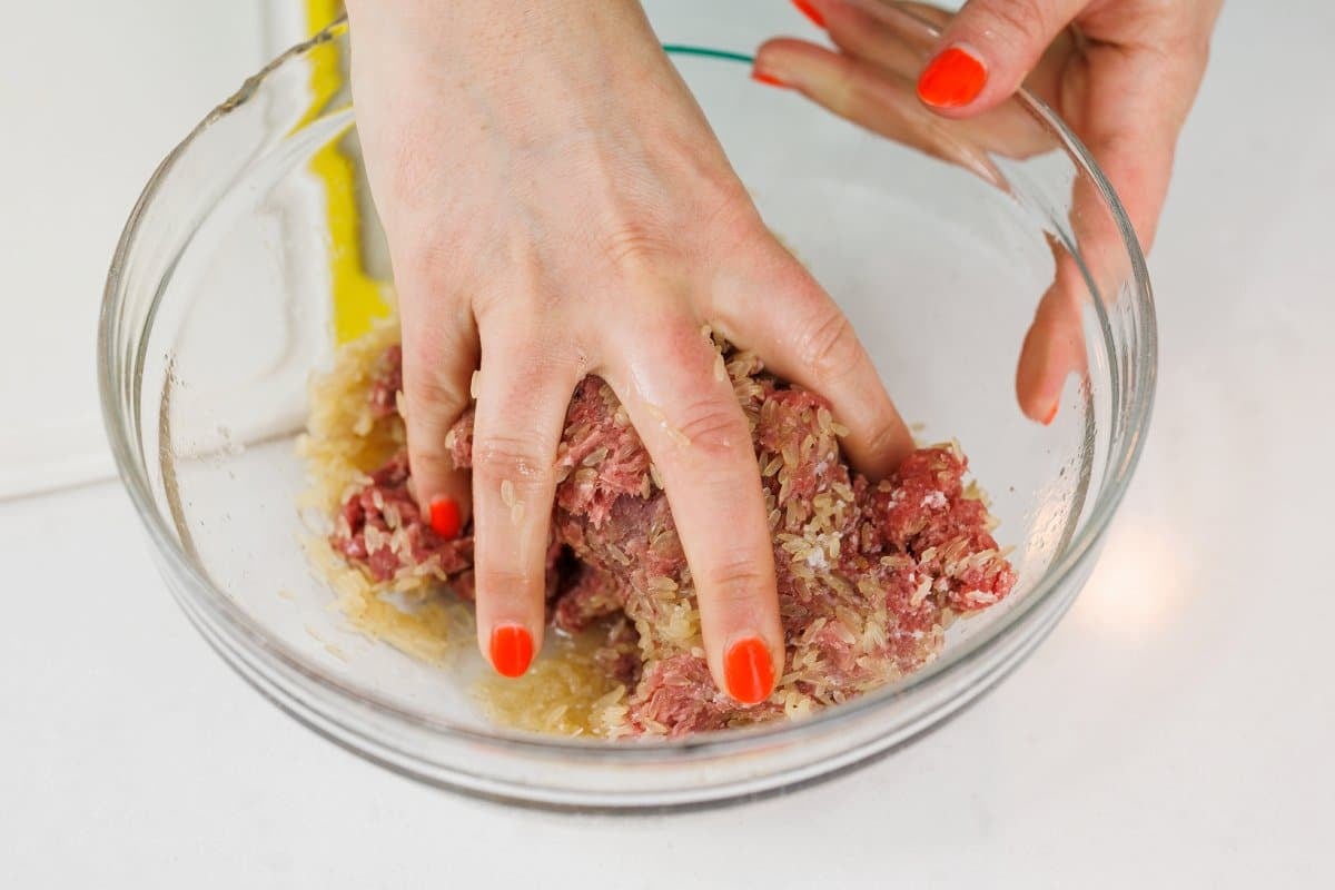 - In a large bowl, combine ground meat, rice, the juice of 1 lemon, salt and pepper.1 pound ground sirloin, 1/2 cup long grain enriched white rice, 1 teaspoon salt, 2 lemons, ¼ teaspoon pepper