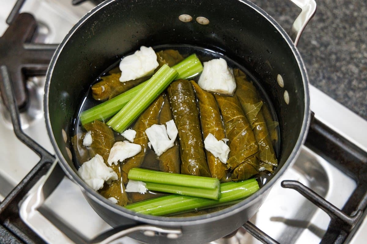 - Add the juice of the second lemon and then cover with water until grape leaves are covered.