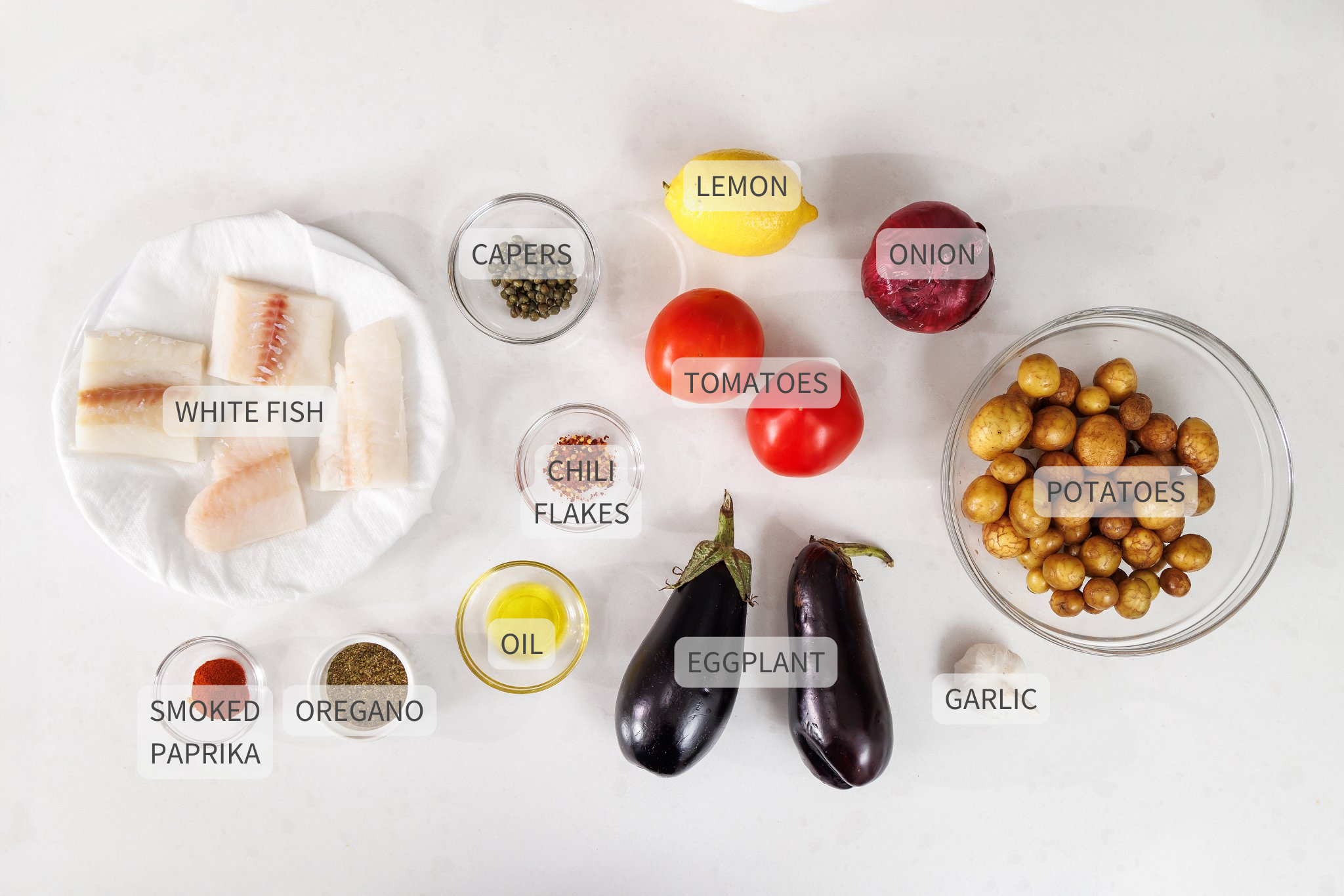 - Herbs & spices: Smoke paprika, oregano, garlic, chili flakes, lemon zest, and capers all add Mediterranean flavor to the fish and veggies.