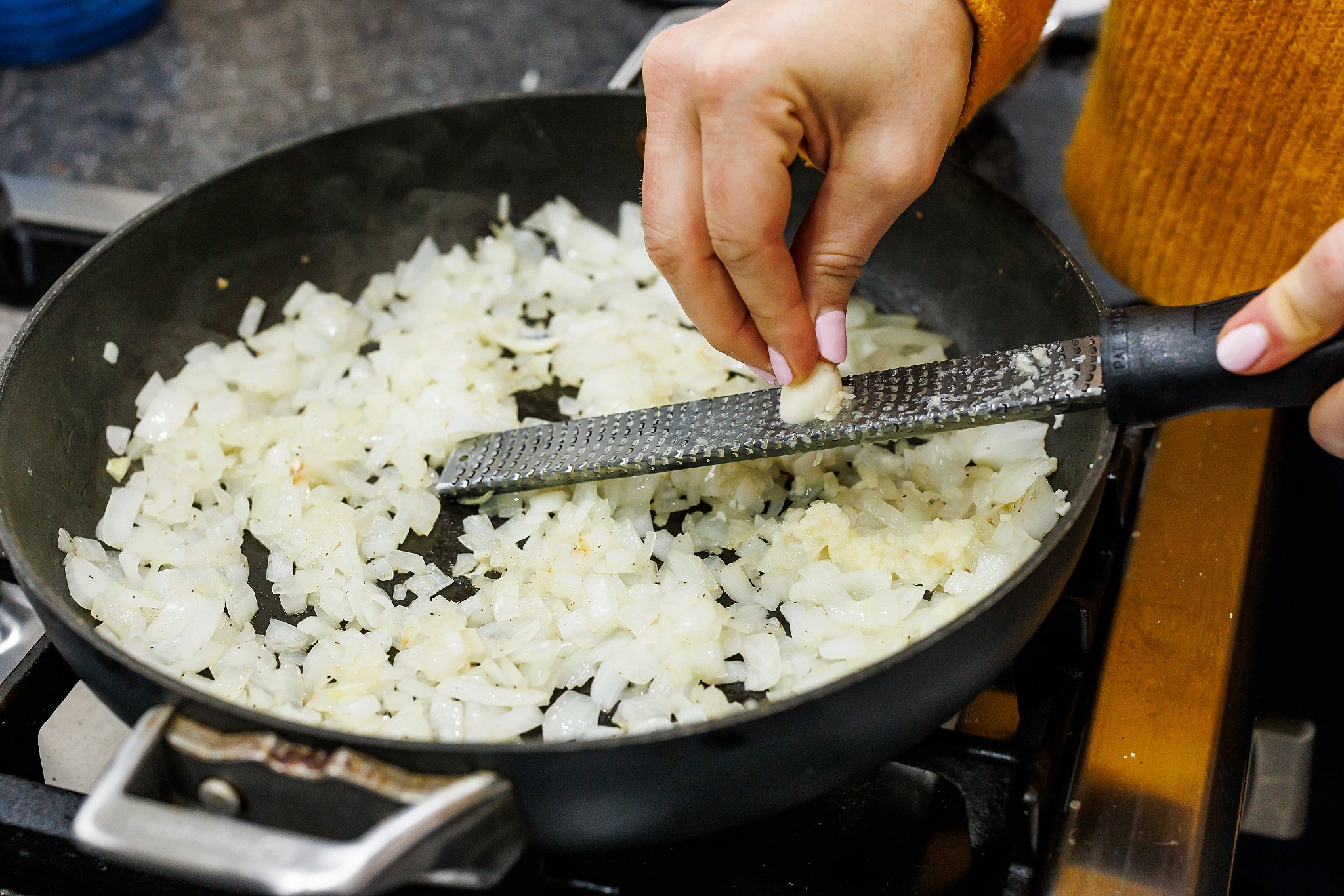 - Onion: White onion caramelizes quickly and deliciously, while being mostly mild in flavor and pairs well with most veggies and proteins.