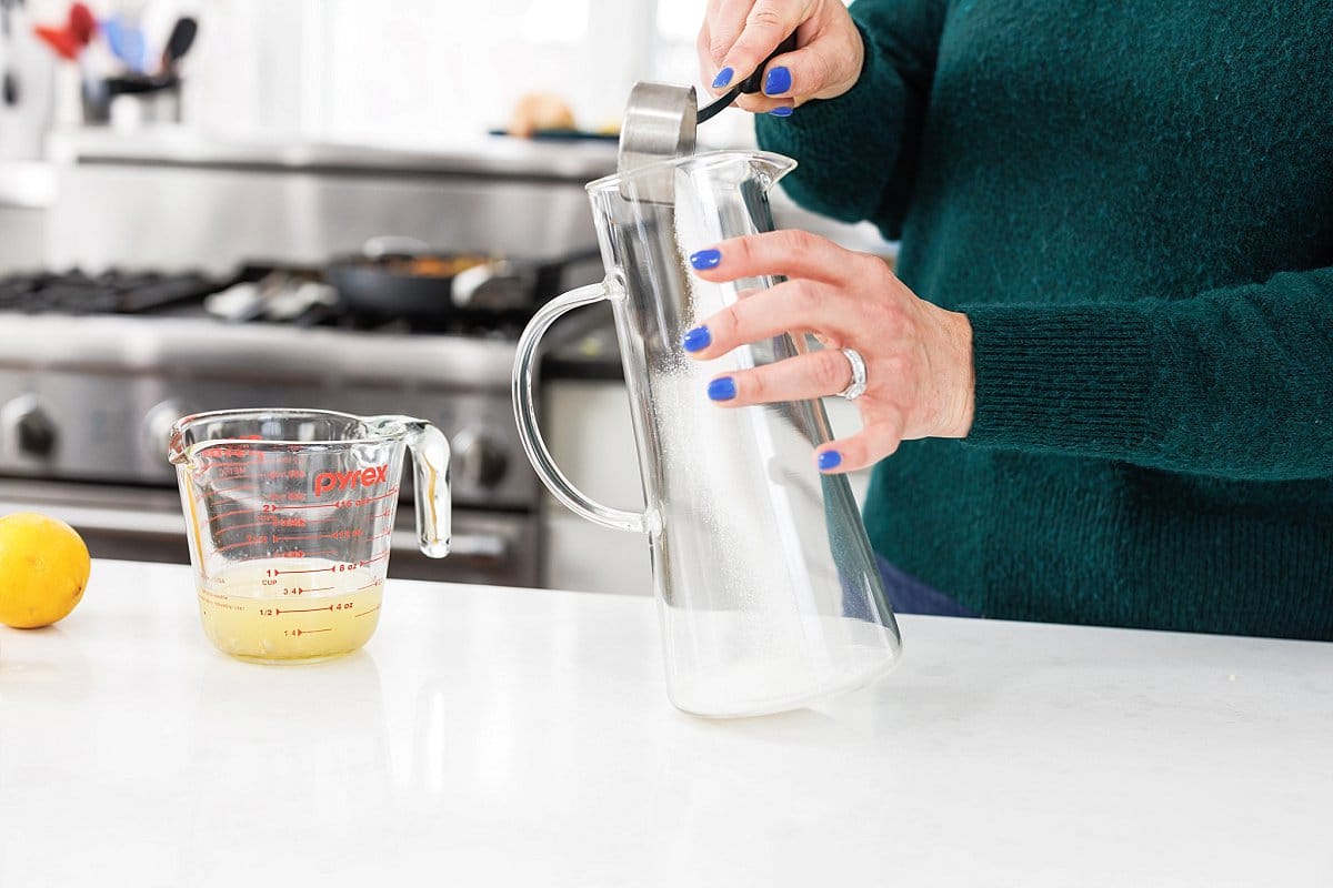 Start your orange blossom lemonade by adding your sugar to a large pitcher.