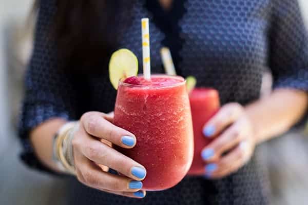 2. When you’re ready to make the sangria slushees, place the wine, peaches, raspberries, orange juice, brandy and chilled simple syrup in a high speed blender. Puree until smooth. Pour in four glasses and garnish with raspberries and lime slices if you wish.