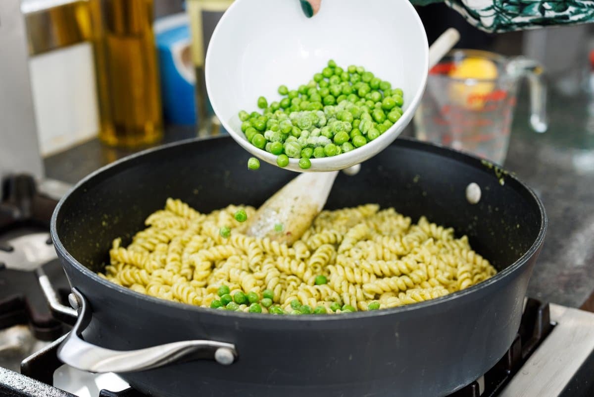 - Stir in cooked pasta, frozen peas and lemon juice. Toss well until evenly coated in pesto sauce. Season with salt and pepper to taste. If you need a bit more liquid, add in a little more starchy pasta water.