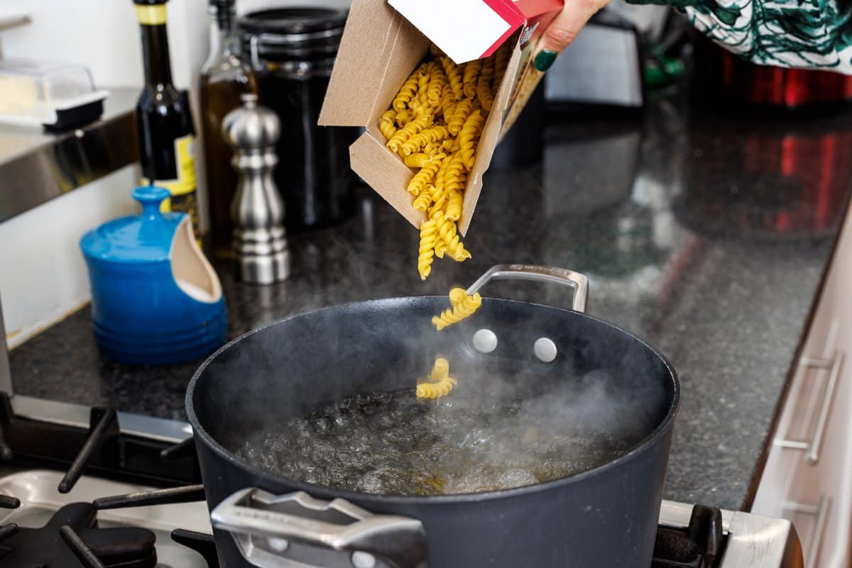 Then take a pot of salted water and bring it to a boil, then add your pasta and cook according to package instructions. Drain, reserving some of the pasta water, then set aside.