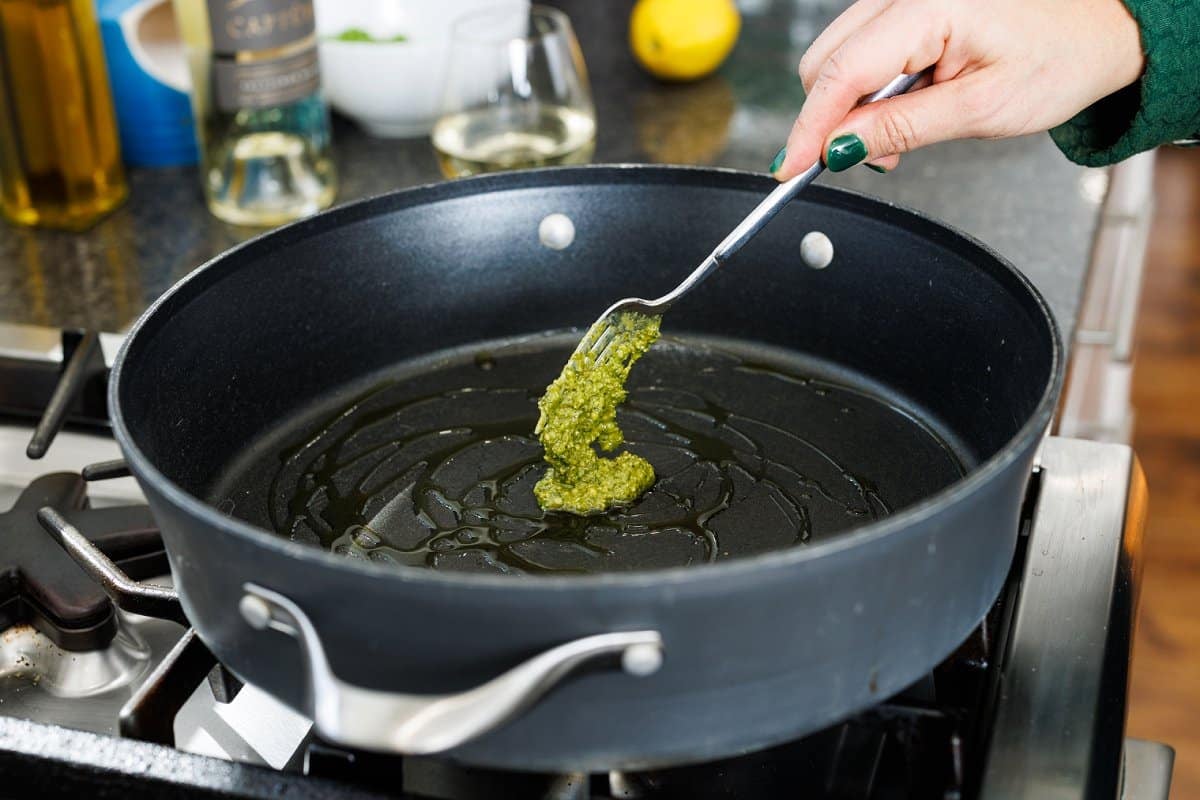 While pasta is cooking, take a deep skillet and add the olive oil and the rest of the pesto over medium-high heat.