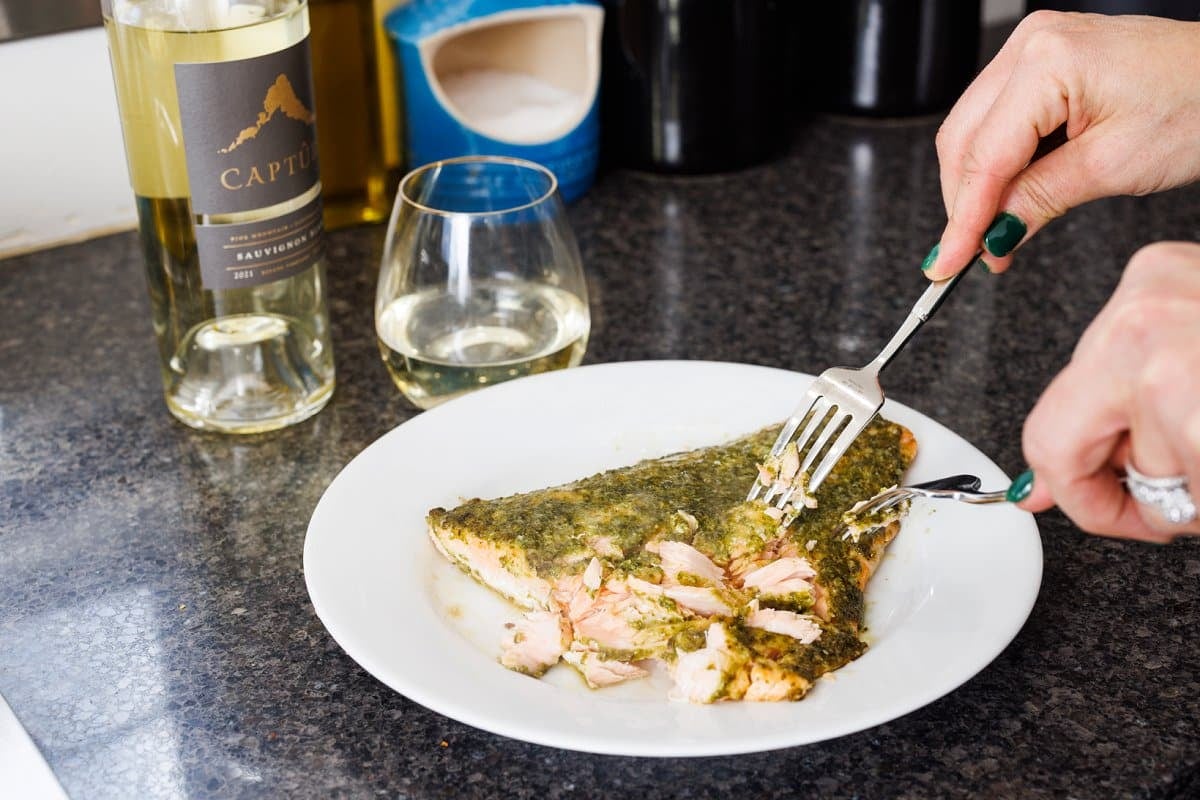 Whether at a restaurant or enjoying your meal at home, seafood and wine go together like peanut butter and jelly. The fruity and fresh taste of wine can help to tone down the “fishy” taste of salmon and other seafood. CaptĂ»re Wines has a wonderful assortment to choose from when it comes to finding the perfect match for your meal. I love to go with a white wine, like their Sauvignon Blanc, but depending on the seafood, you may like a more bodied red. But I find the dry, acidic white wine pairs well with the pesto which is fatty and salty from the cheese and oil. The floral basil also pairs well with the grapefruit notes in the sauv blanc.Â
