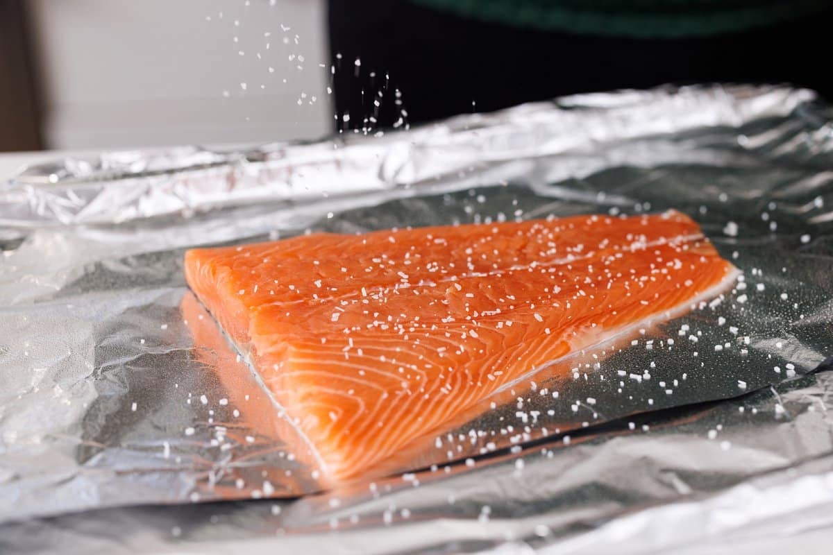 - Pre-heat oven to 350 degrees and line a baking sheet with foil. Spray with cooking spray then place salmon on top and pat dry with paper towel.