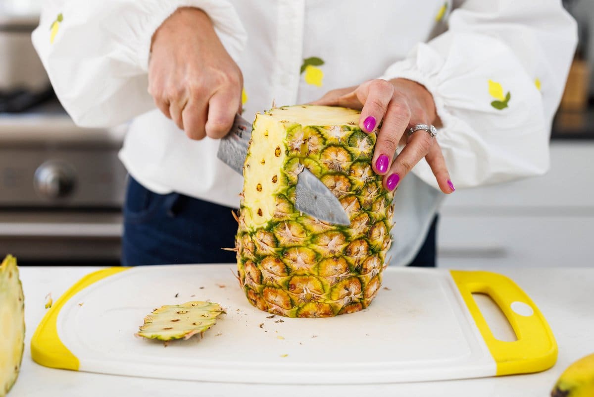 Start your Pineapple Banana Avocado Smoothie by cutting your fresh pineapple, making sure you cut enough to remove any green or brown spots so you don’t get any bitterness from the shell.