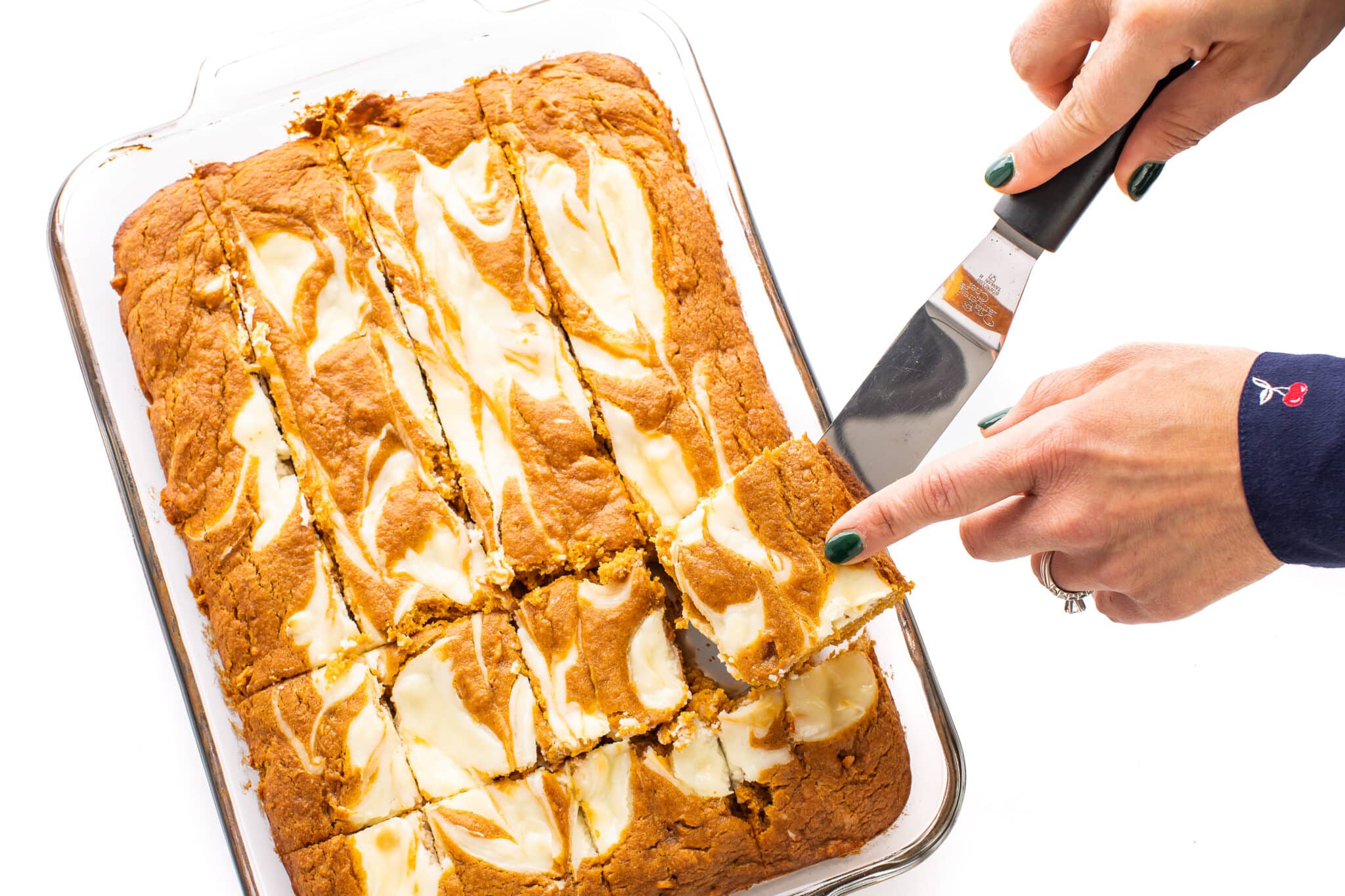 Today’s dessert is perfect for fall and a great use of extra pumpkin you might have sitting around: Pumpkin Bars with Cream Cheese Frosting. The secret to these moist and flavorful pumpkin bars is a rich and creamy frosting that is swirled in the batter before baking. Another secret ingredient is shredded carrots! Not only do they add extra vitamins and nutrients, but the shredded carrots keep the batter super light and moist. The end result is a pumpkin bar scented with warm fall spices and dotted with delicious cream cheese. Looking for more healthy desserts? If you like these pumpkin bars, be sure to check out my hermit cookie bars next!