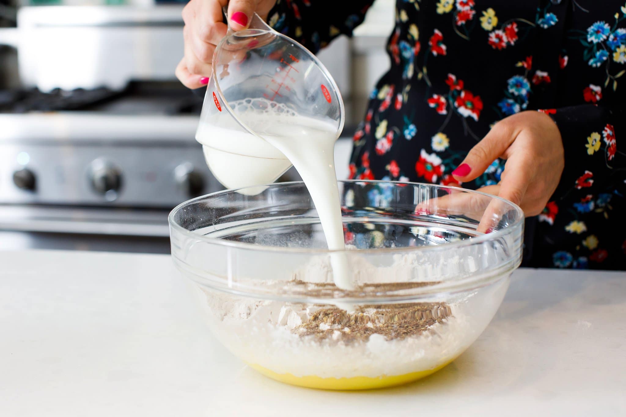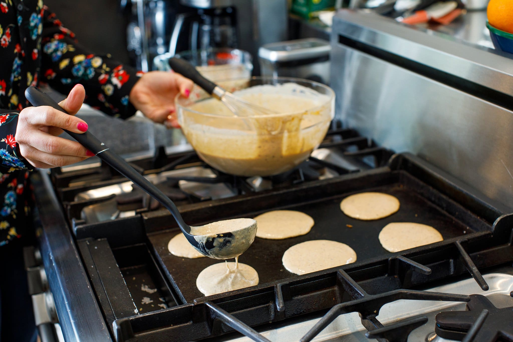 This pancake griddle is my secret weapon when it comes to making perfectly fluffy pancakes every time! In addition, it is important to mix all wet and dry ingredients separately. However, be careful not to over-mix your ingredients. You want them just combined, not completely blended. Otherwise, your pancakes will be flat and sad.