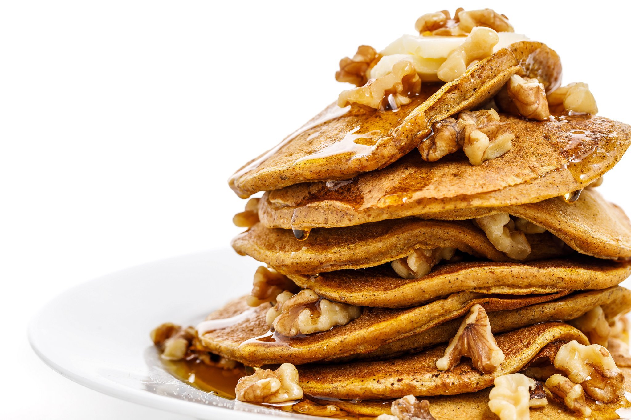 Personally, I love to top the whole stack with chopped pecans in order to add protein and texture. However, walnuts or sliced almonds are delicious, too! Feel free to add fruit, nuts and seeds, nut butters, or whipped cream!