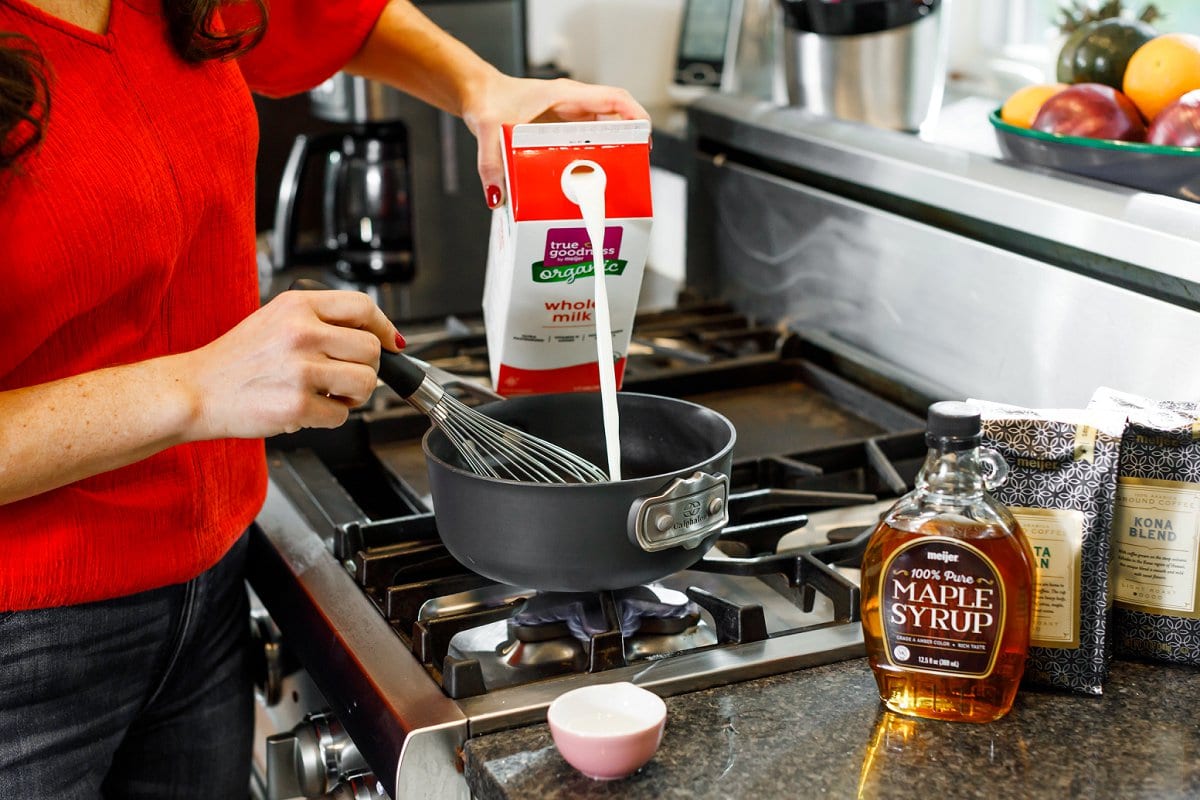 - While the coffee is brewing, whisk together pumpkin pie spice, maple syrup, vanilla and milk in a small sauce pot over medium heat. Continue whisking until bubbles start to form around the edges.