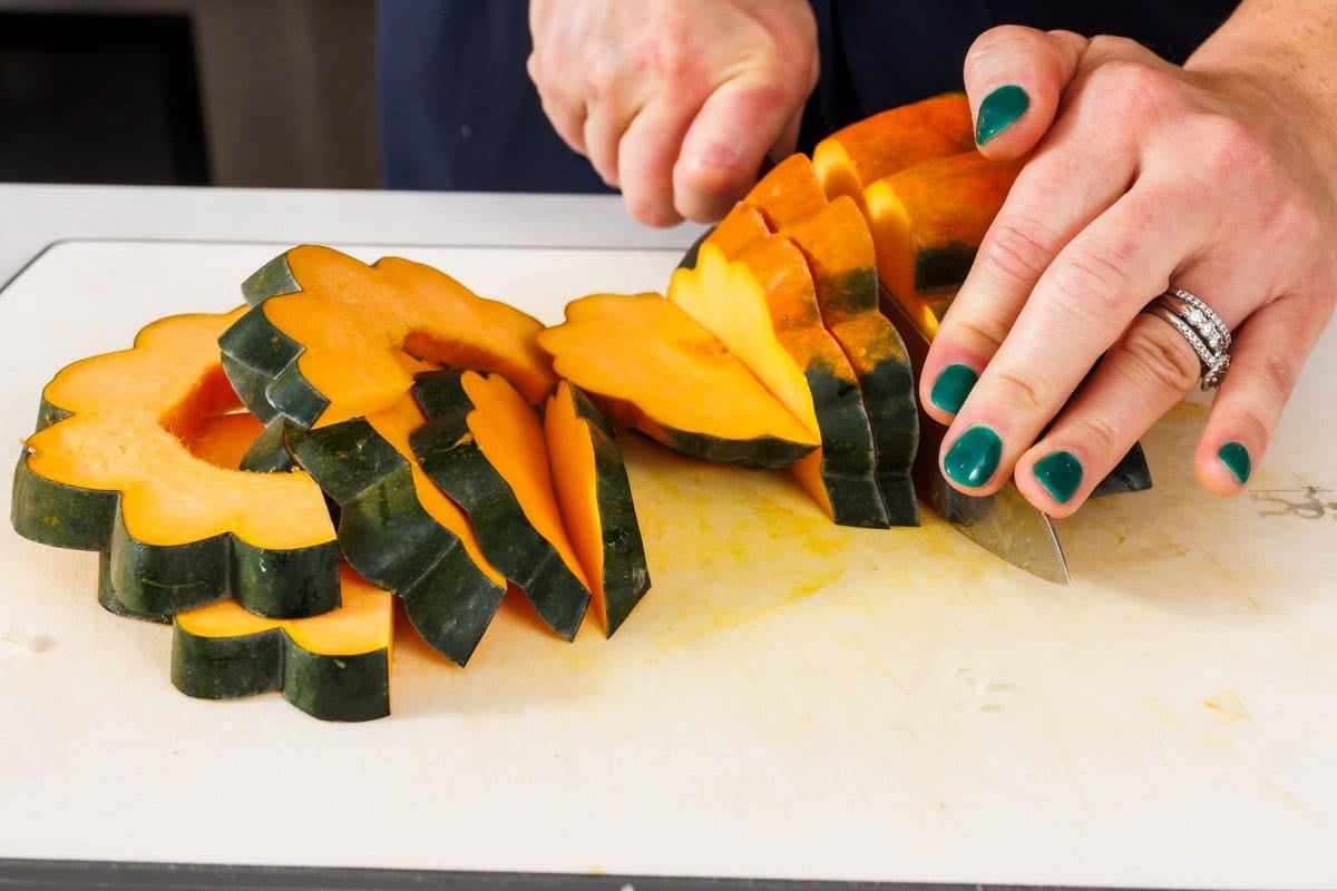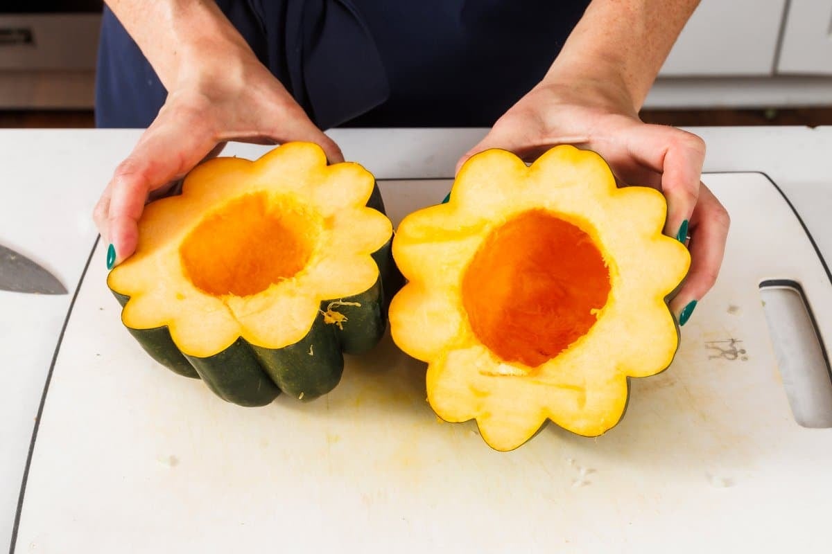 Start your roasted acorn squash with tahini sauce by taking your acorn squash and cutting it in half. Then cut off each end.